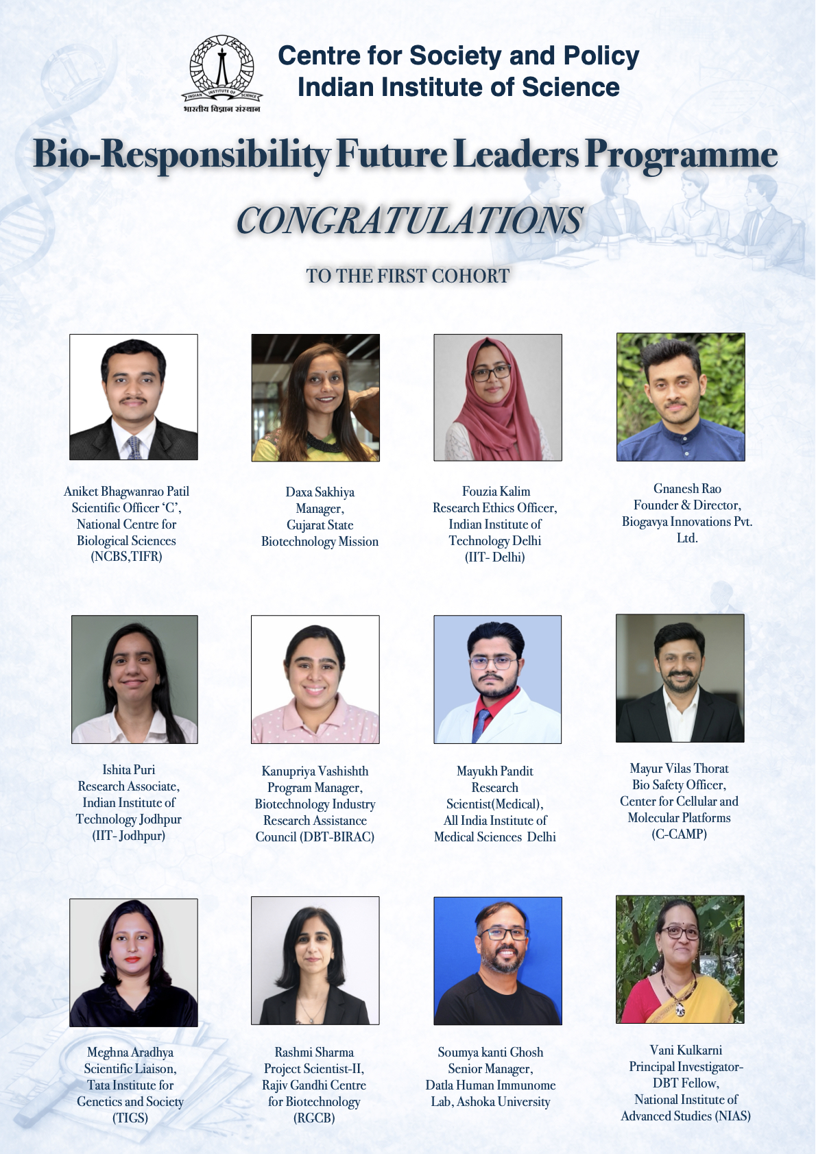 The Bio-responsibility Future Leaders Programme (BFLP) is a year-long, part-time training programme focused on building the future leaders to promote safe, secure and responsible research and innovation in life sciences in India. The programme is run by the Centre for Society and Policy, Indian Institute of Science, Bengaluru. The programme will strive to create national capacity at the intersection of life sciences, security, and policy by training and supporting emerging leaders through interactive workshops, seminars, and high-level policy roundtable discussions.